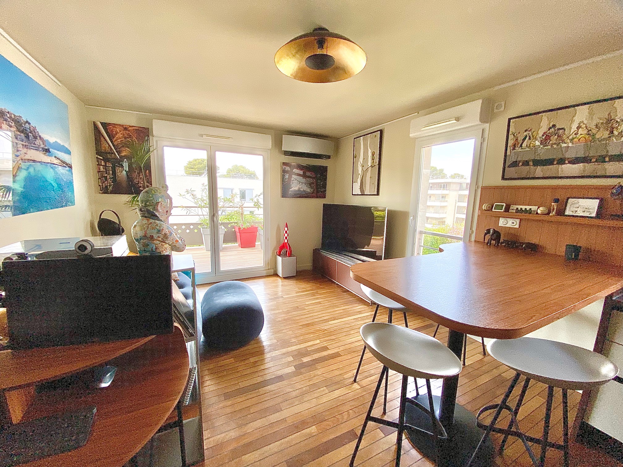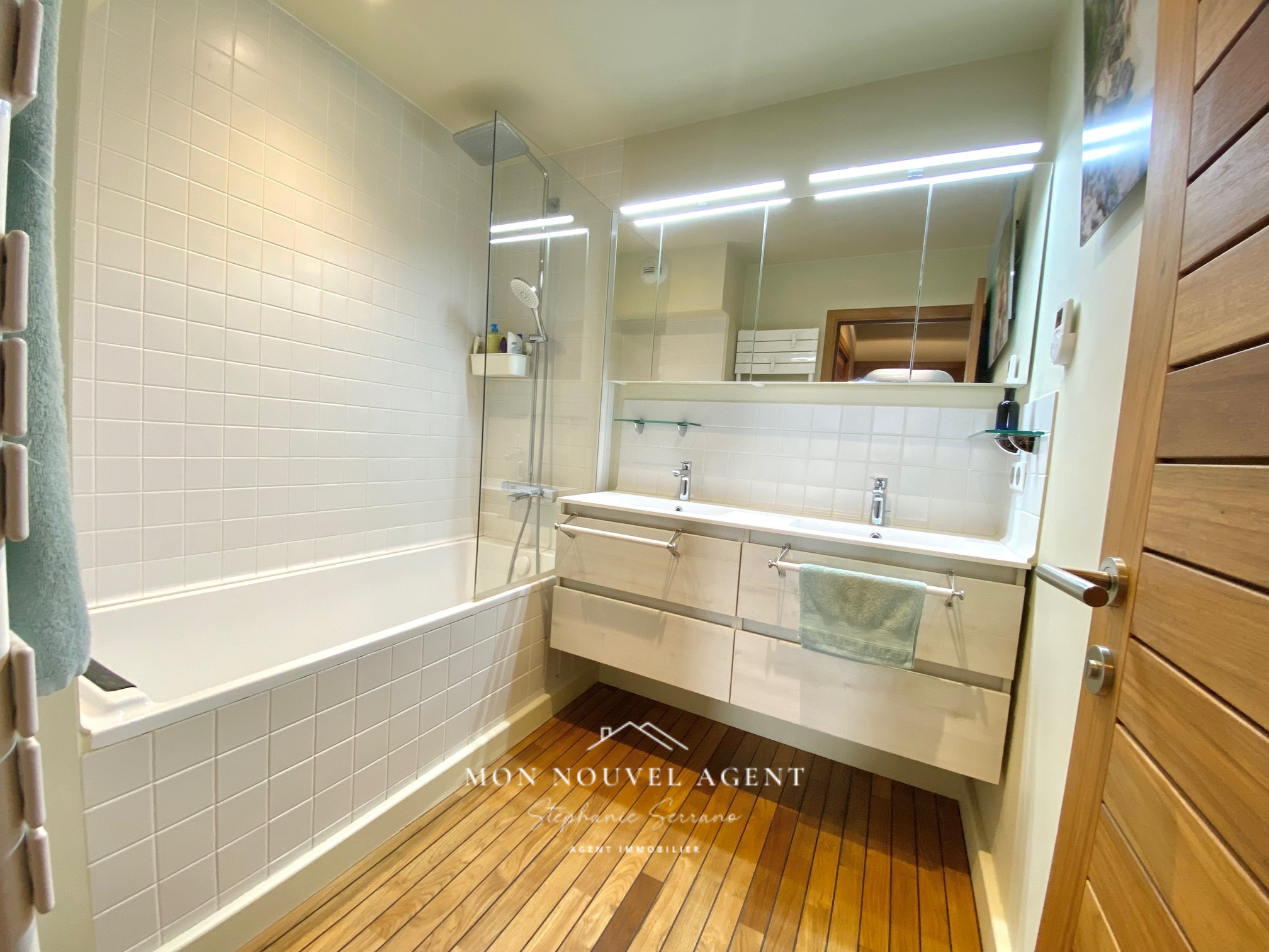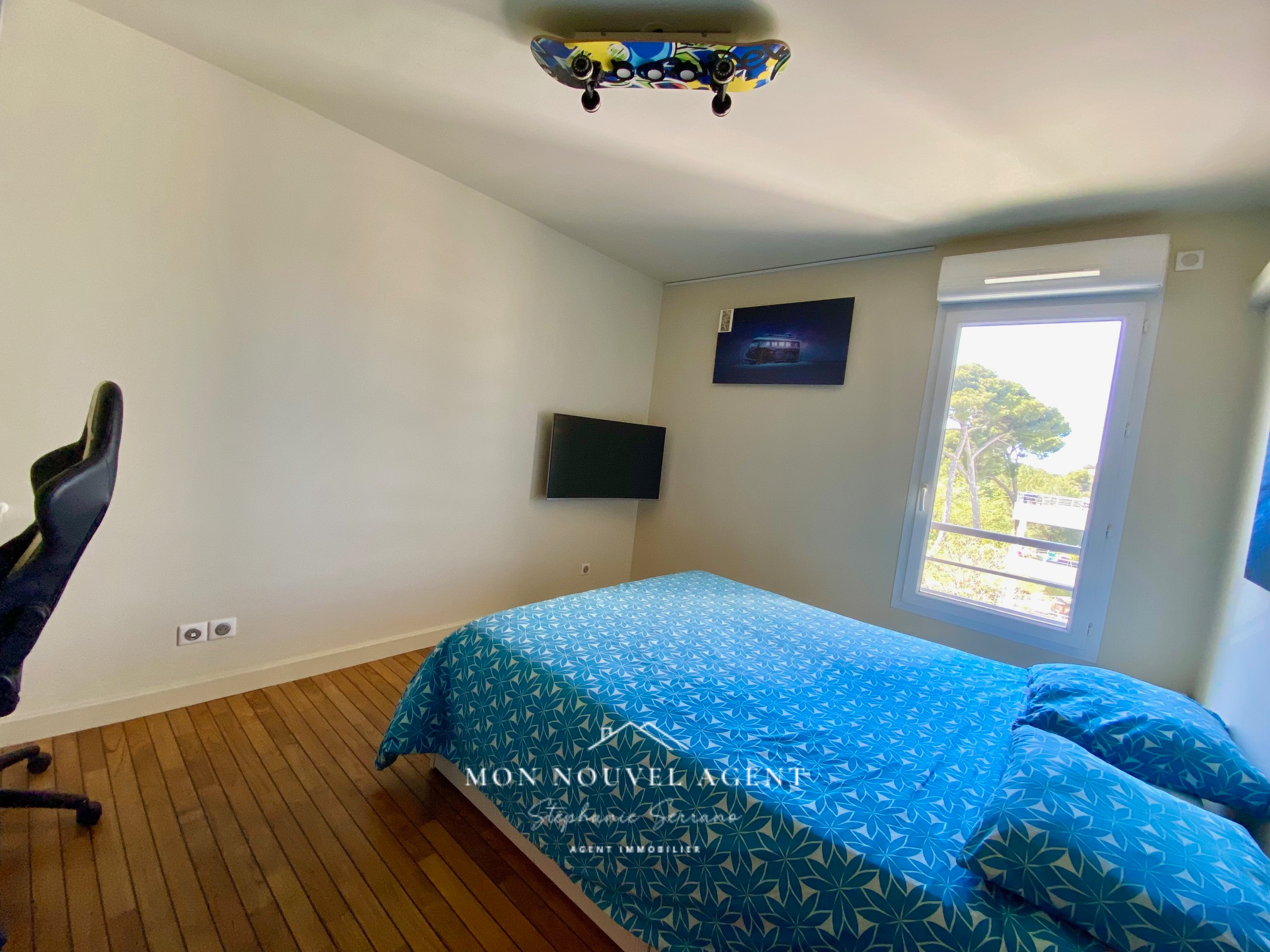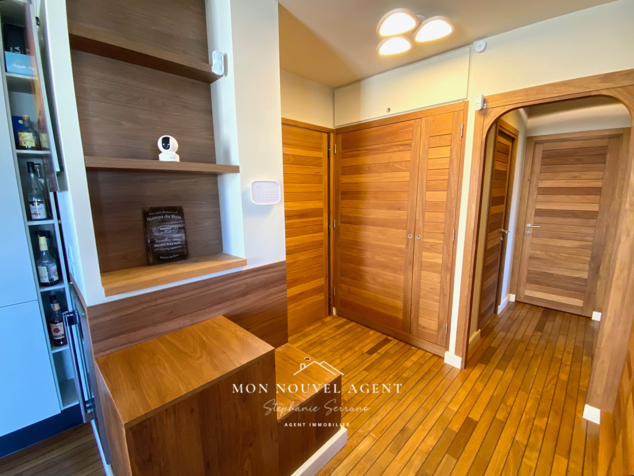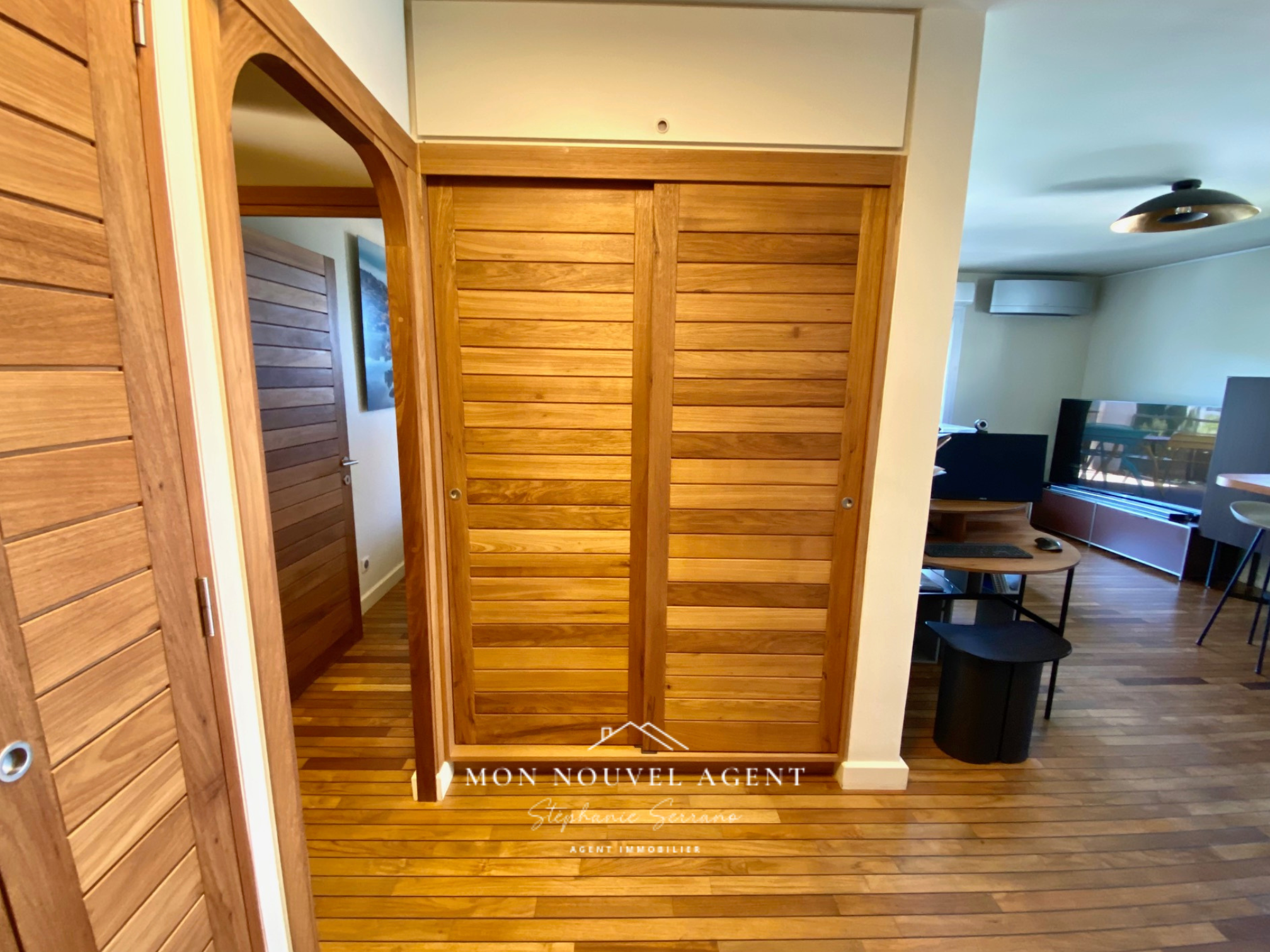 Cet appartement est équipé de fenêtres PVC double vitrage, volets roulants électriques, climatisation réversible Daikin dans le séjour et les chambres, parquet et menuiseries en Teck, alarme appartement et garage. Appartement totalement rénové en 2020, Cuisine Équipée: Plaque induction, Hotte, Micro Ondes, Four, réfrigérateur congélateur combiné, Cave à Vin… Salle de Bain, Sanitaire, Peinture, Porte Bois en Teck…